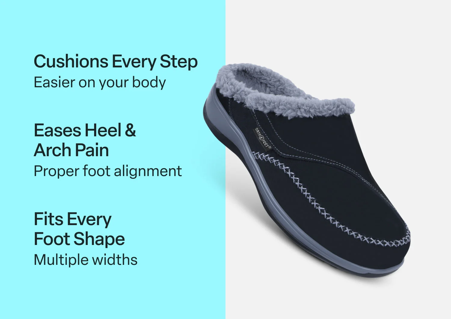 The adjustable side strap on this suede slip-on slipper opens wide to welcome feet into faux fur-lined luxury, with a heel lip that helps keep them on. Under the cozy warmth is full-foot cushioning and pain-relieving support of the Ortho-Cushion⢠System. Charlotte's roomy toe box keeps the pressure off sensitive conditions and allows feet to move freely, all around the house.