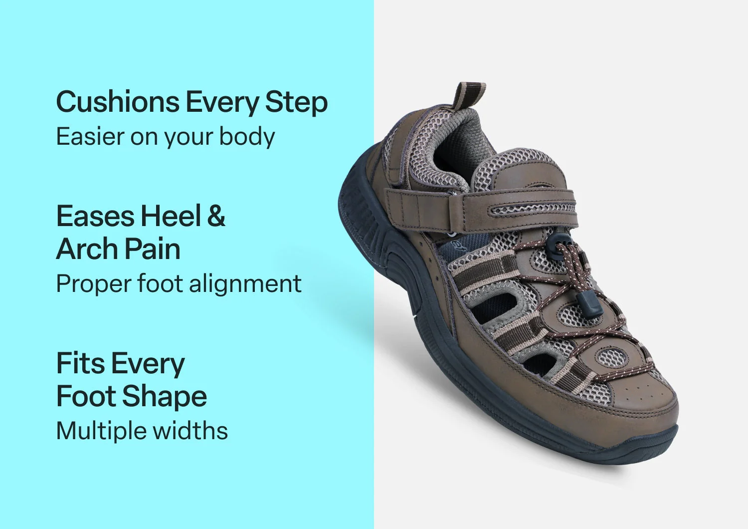 Explore your world in the Clearwater, a versatile, lightweight sandal ready to keep your foot cool and protected, with a closed-toe leather upper and the support and comfort of the Ortho-Cushion⢠System. The two-way inset strap opens and adjusts on both sides for easy on & off, while the no-tie bungee closure and adjustable heel strap make a pressure-free fit easy.