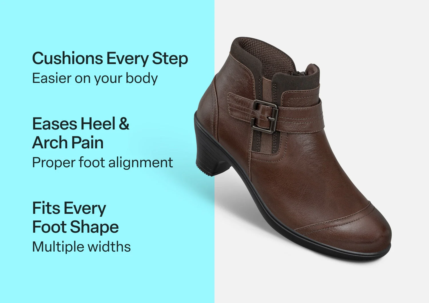 Who knew a stylish leather boot with a two-inch Bioheels⢠could offer the walking comfort of a sneaker and then some? Emma makes the impossible look easy, with Ortho-Cushion⢠System support that evenly distributes foot pressure and a roomy toe box to keep every hour pain-free. A zipper for getting in easily and an adjustable strap over stretch gore fit your every move.