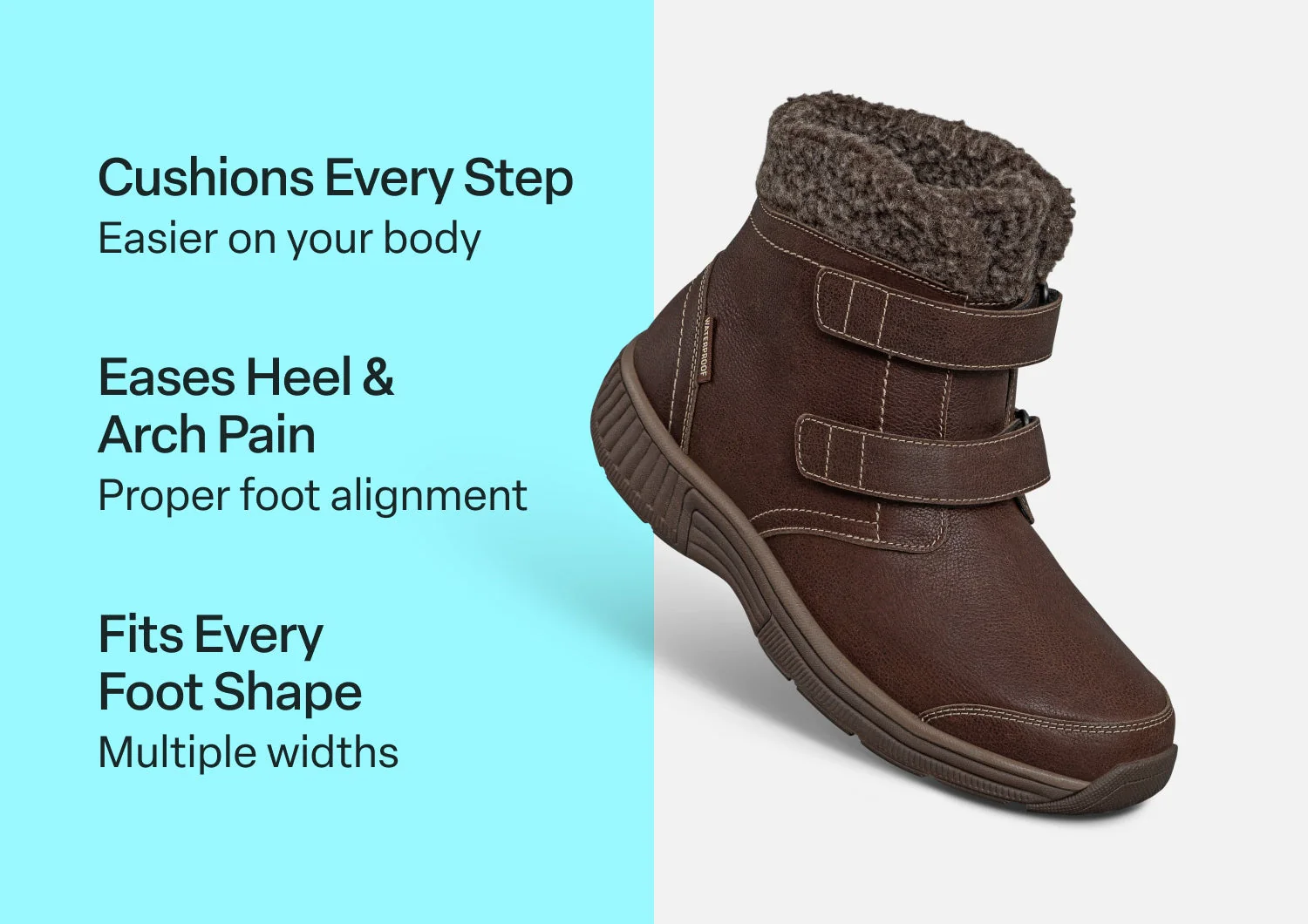 Meet Florence Waterproof, your new best friend for getting out in cold, wet weather. Two adjustable straps make these leather boots easy to put on and find your perfect fit. It might be raining or snowing out there, but your feet will be comfy, cozy and dry in a padded fabric interior, with extra depth, and customizable, Ortho-Cushion⢠System support. Make winter pain-free!