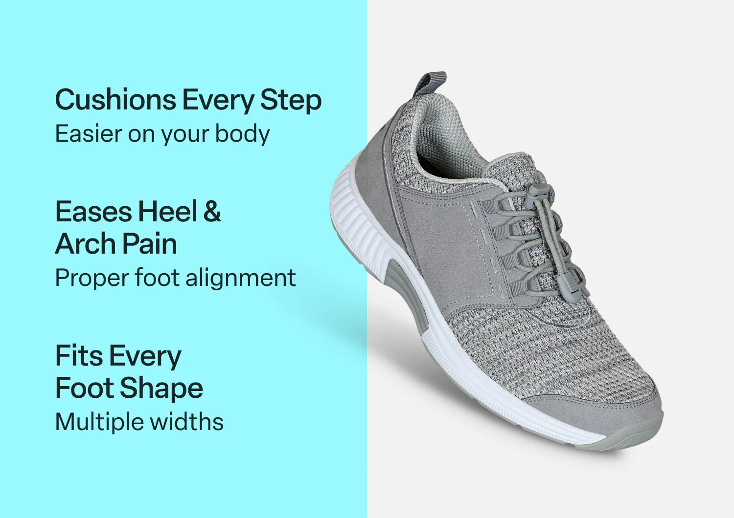 Meet your new partner in keeping active, with a stretchable fabric upper and no-tie bungee lace that make getting into your sneakers as pain-free as wearing them. Our Ortho-Cushion⢠System absorbs impacts and smoothly propels your stride, while the padded, breathable upper hugs every curve, bump and bone of your foot, for a relaxed pressure-free fit.
