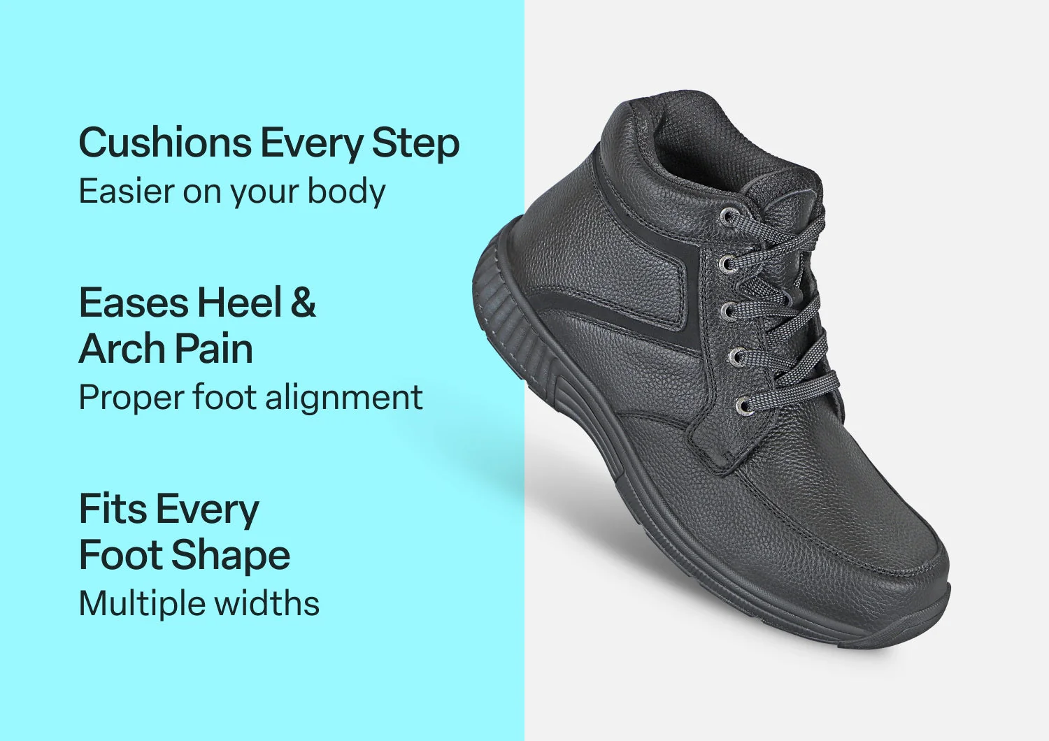 Walk tall in the versatile style of this leather boot, boasting excellent ankle stability, adjustable arch support and a roomy toe box. With the Ortho-Cushion⢠System comfort and support, and a padded interior with extra depth, the day ahead is pain-free. Your feet will appreciate less impact and a smooth roll of every step, thanks to the removable Ortho insole and mild rocker design.