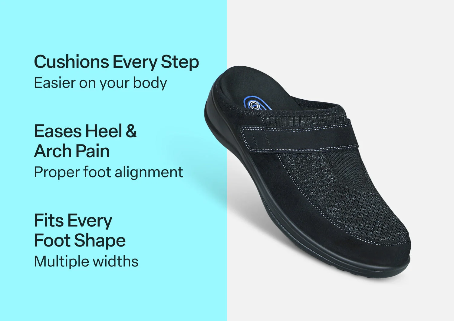Active support, a pressure-free fit and pain-relieving comfort are in the house. Louise hugs your feet in stretchable mesh that follows every curve, bump and bone, and the adjustable strap secures your fit for effortless indoor living. With anatomical arch support and all the mobility advantages of Ortho-Cushion⢠System support and cushioning, these slippers save every day.