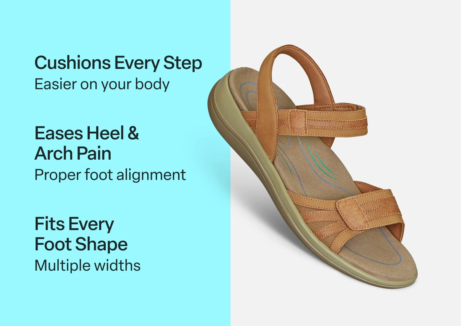 Step into beautifully detailed leather and premium all-day comfort. The fully adjustable front strap opens completely, and the adjustable inset strap opens with a tab, making it a breeze to get these on and off. Enjoy a secure, personal fit with clever design features that avoid bone pressure and sensitive areas, and customizable Ortho-Cushion⢠System support for everywhere you go.