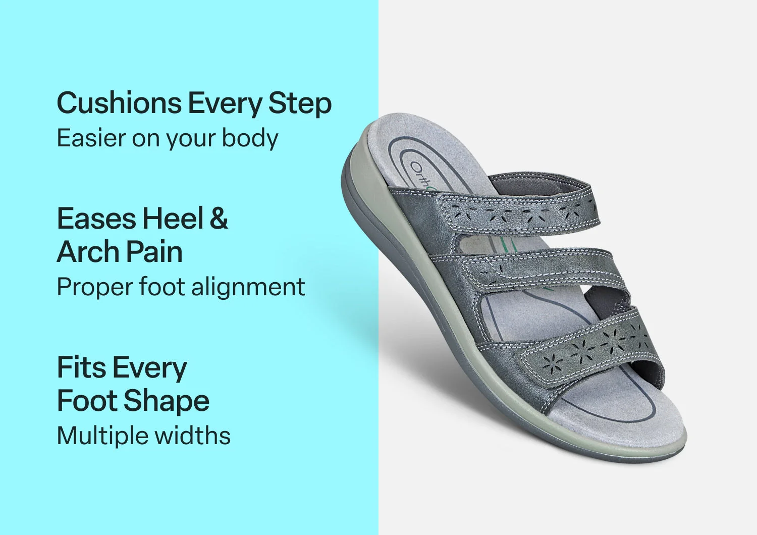 Every comfy strap on our pretty three-strap slide completely opens for true "step-right-in" ease and adjustability that forms to every curve and bump of your foot. Orthofeet's innovative comfort engineering makes going out pain-free, with a foot-hugging fit that keeps you happily in your sandals, not sliding out, for carefree fun under the sun.